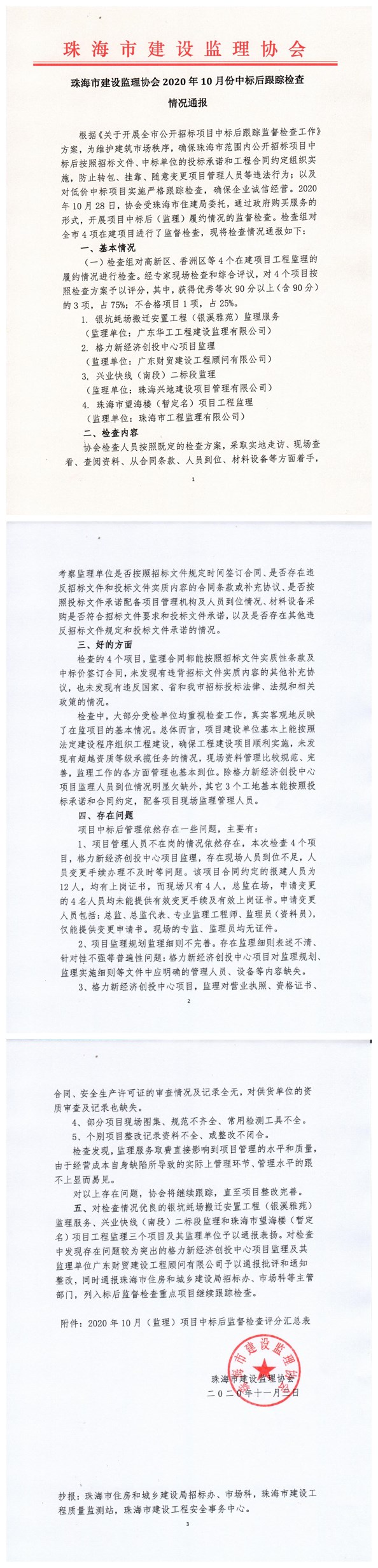 珠海市建设监理协会2020年10月份中标后跟踪检查情况通报