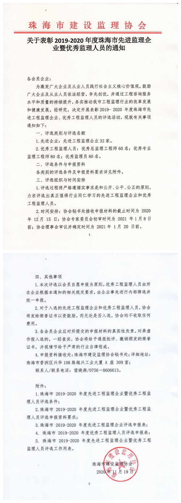 关于申报2019-2020年度珠海市先进监理企业暨优秀监理人员的通知