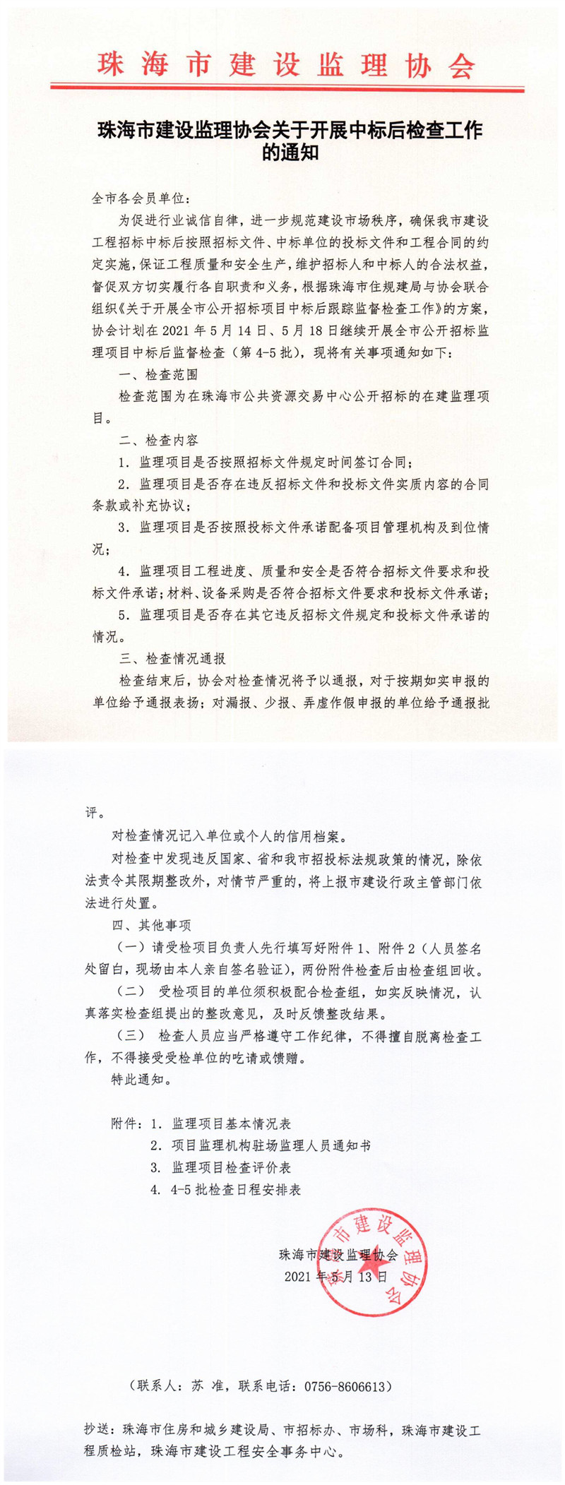 珠海市建设监理协会关于开展中标后检查工作的通知(第4-5批)