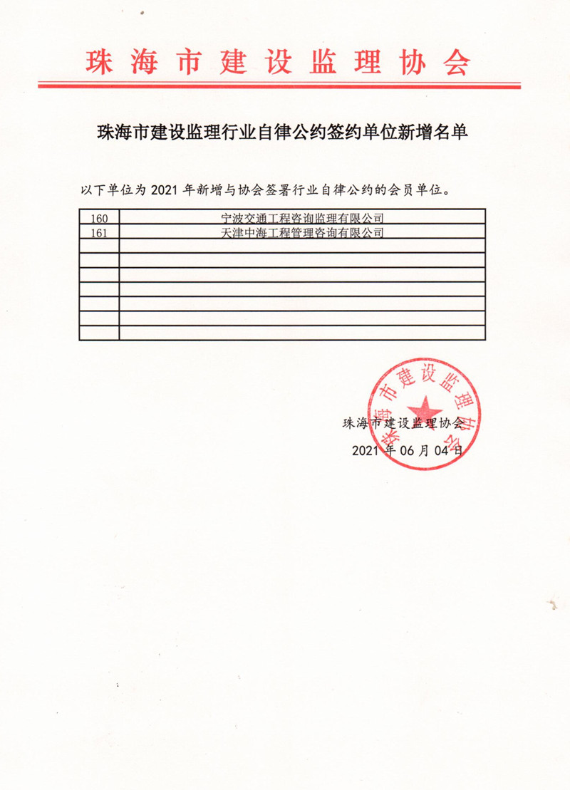 > 珠海市建设监理行业自律公约签约单位新增名单