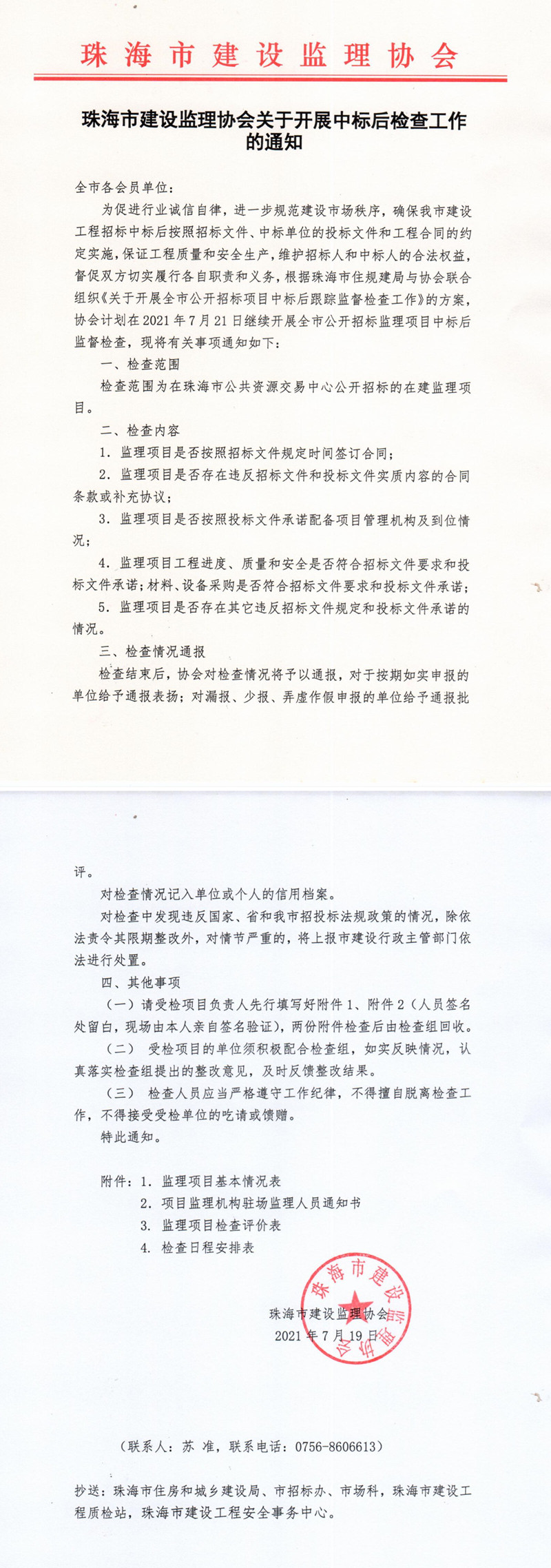珠海市建设监理协会关于开展中标后检查工作的通知(7月份)