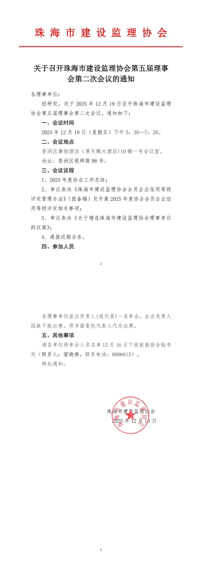 关于召开珠海市建设监理协会第五届理事会第二次会议的通知
