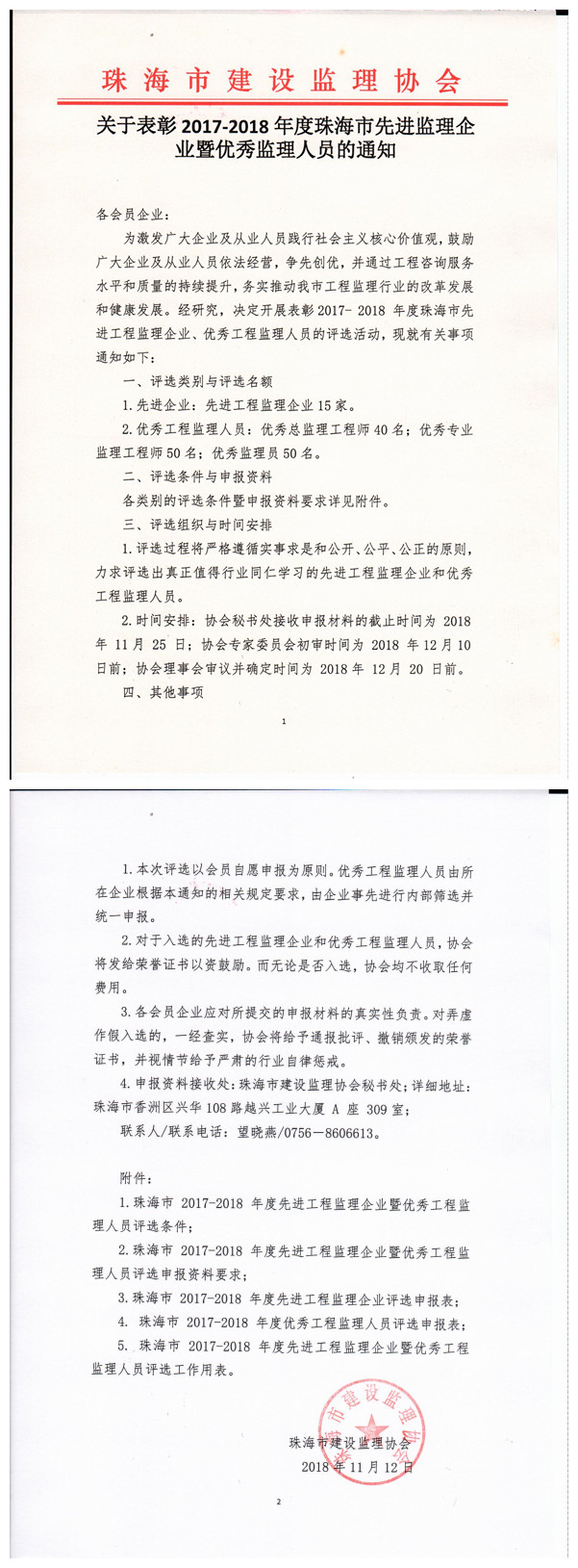 关于申报2017-2018年度珠海市先进监理企业暨优秀监理人员的通知