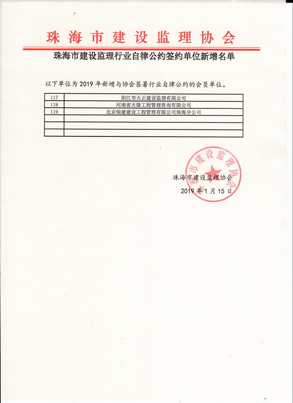 > 珠海市建设监理行业自律公约签约单位新增名单