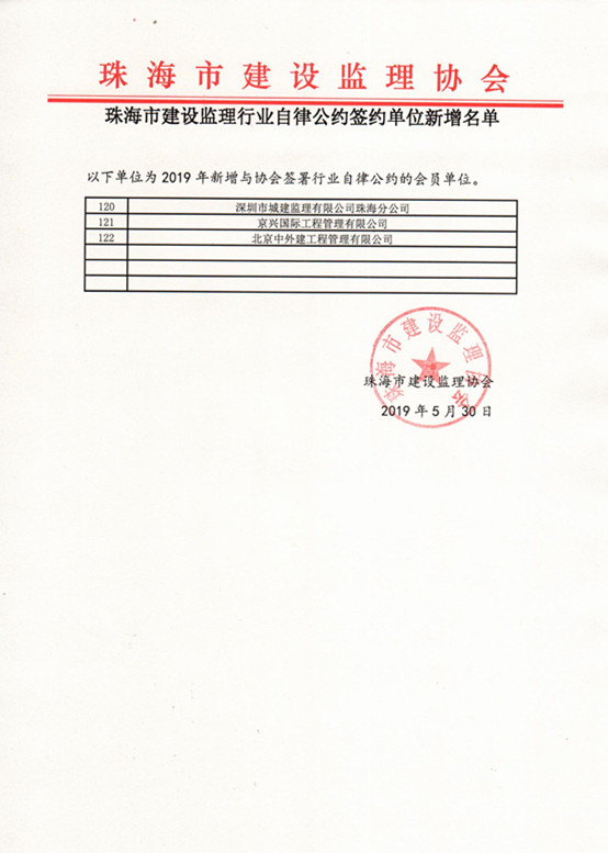 珠海市建设监理行业自律公约签约单位新增名单